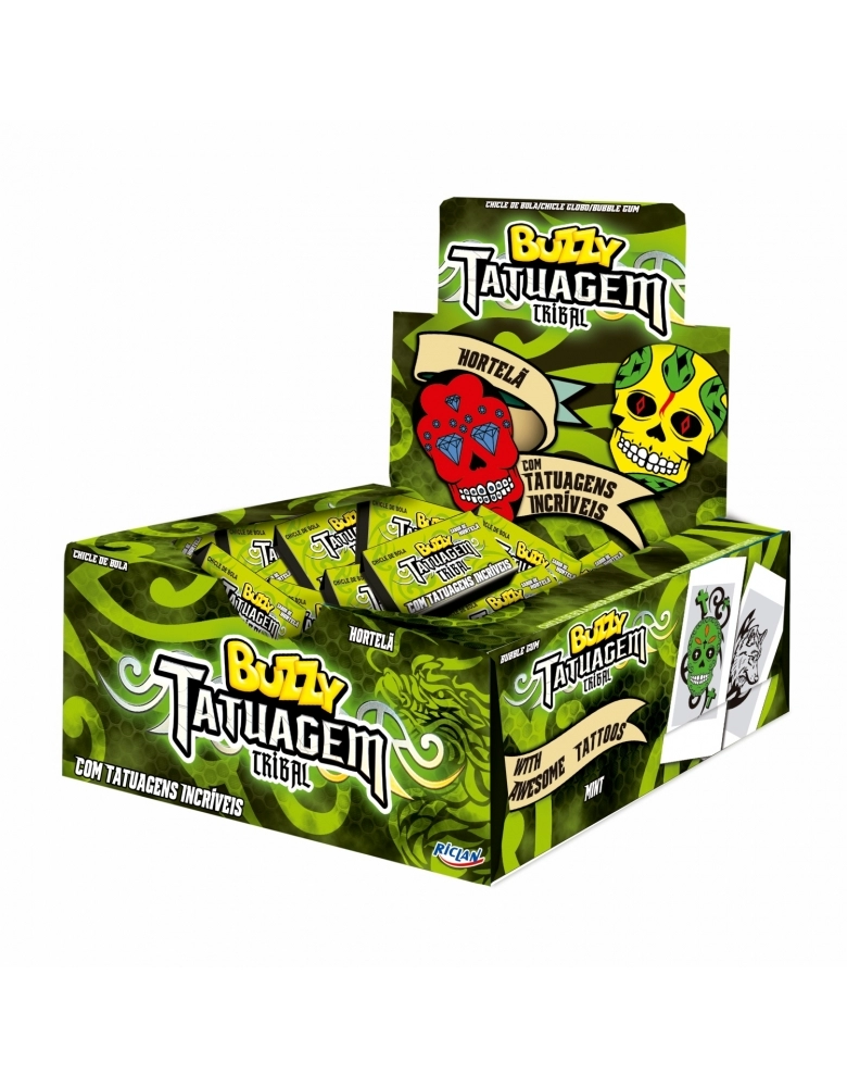 ALIMENTO>DOCES E CHOCOLATES>CHICLE>CHICLE BUZZY TATUAGEM TRIBAL HORTELÃ 100UN