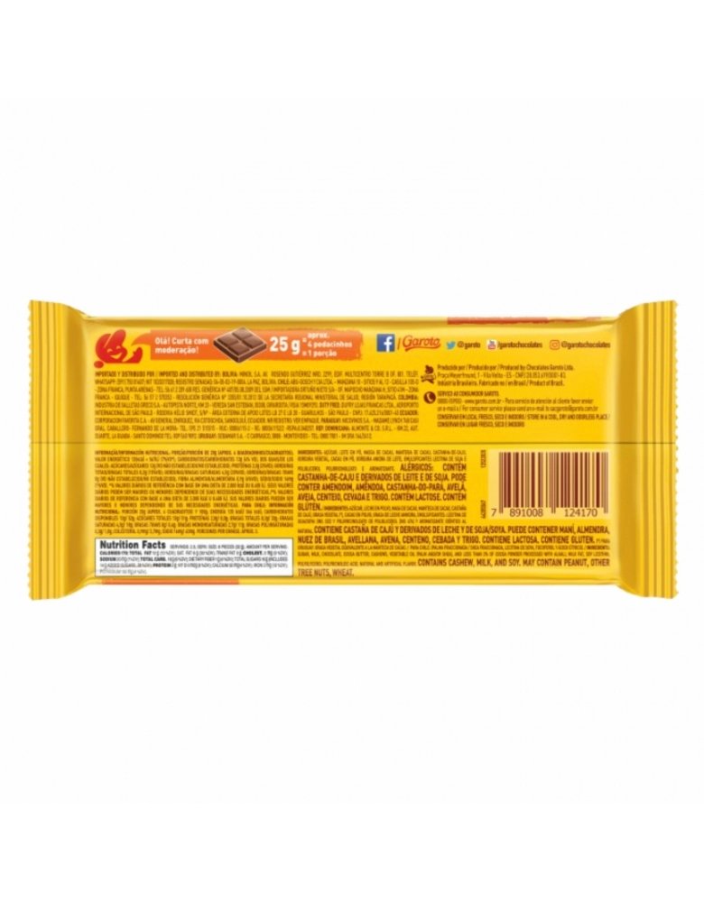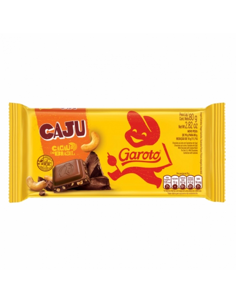 ALIMENTO>DOCES E CHOCOLATES>CHOC. BARRA>BARRA DE CHOCOLATE GAROTO CASTANHA DE CAJU 16X80G
